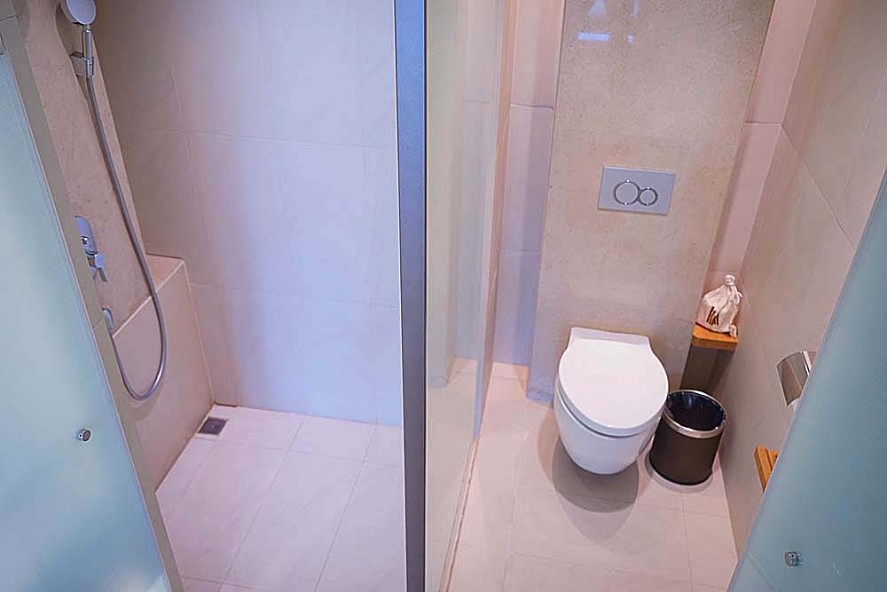 衛浴設備處,將沐浴、廁所、泡澡等空間區隔,不但乾溼分離,若遇到有人想洗澡又有人想廁所時,完全不用擔心會尷尬阿。