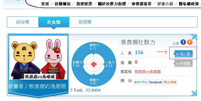 活動開始至今,熊的排名起先很後面,綜合/美食/旅遊 = 4XX/18X/21X名,但在眾多朋友與粉絲的幫忙之下,熊的排名已增加為綜合/美食/旅遊 = 263/121/106名,在此,熊真的很謝謝大家,感謝粉絲們的打氣聲、感謝朋友私下密語、感謝高職同學偷偷幫我宣傳、感謝大學/國小親友團以及被熊抓來投票的朋友們,超愛你們的啦>///////<。