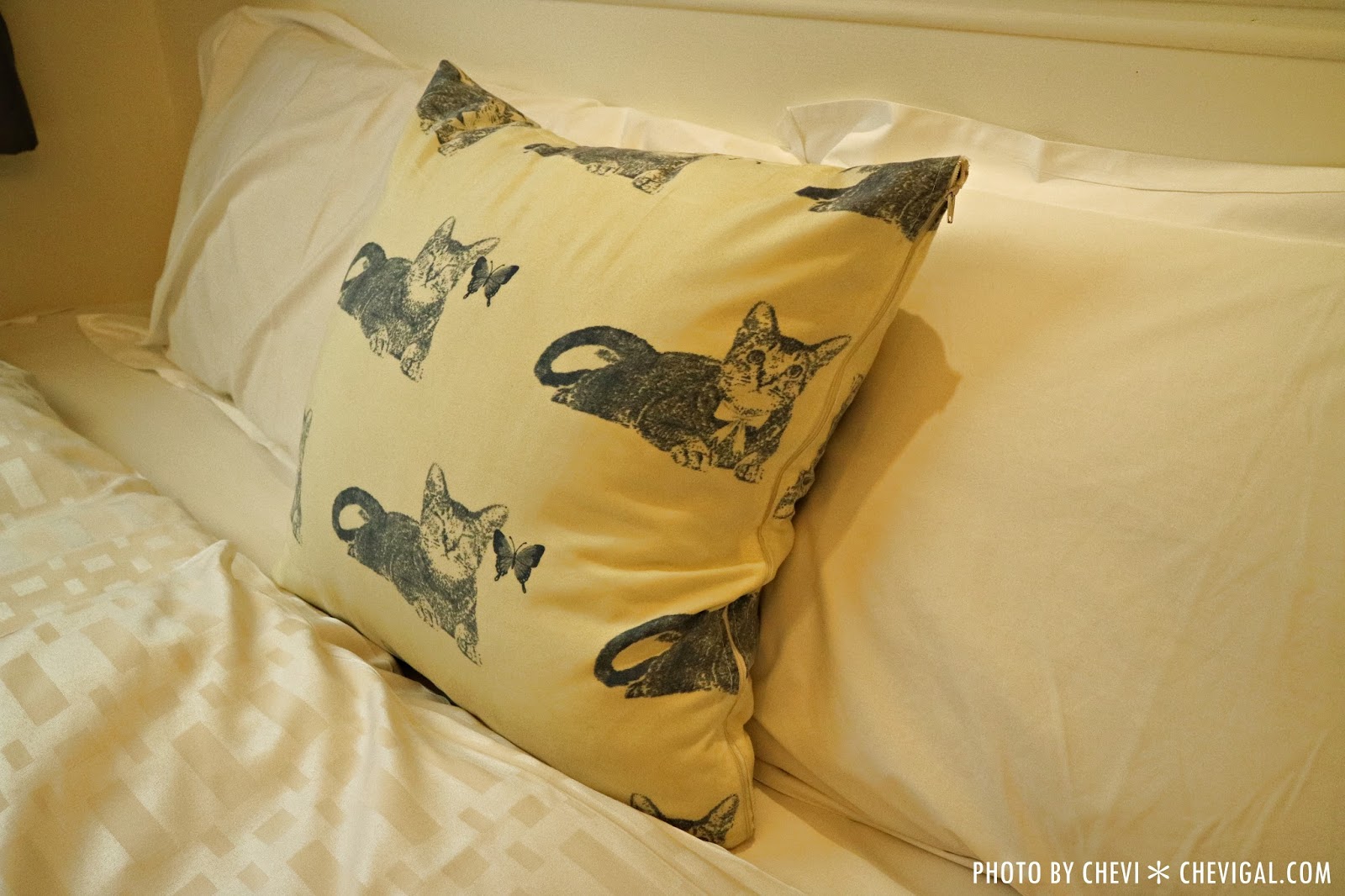 床頭的燈光自然地灑落在床上,後頭有著城市圖紋的壁紙更襯脫出了港都的現代感。