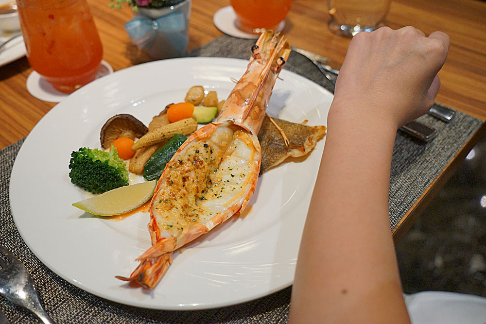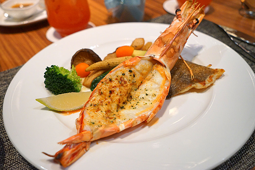 香煎鰈魚&爐烤斑節蝦襯季節時蔬,好吧!含恨帶過,想也知道這麼大隻的蝦與我無緣了…