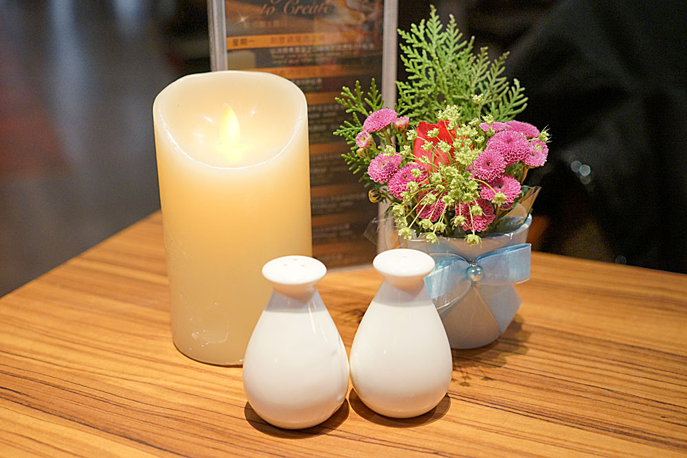 不知道是不是情人節的關係,桌上的小佈景也很有趣,尤其是那個蠟燭,原距離看時超逼真,還會有火光閃動的情境,但實際上…上面的燭光是紙片。