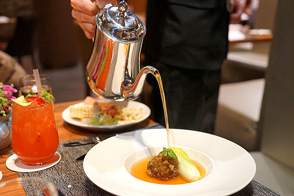 主餐前的湯品是法式黃金清湯襯松露獅子頭,一開始上桌時沒有湯,但會由服務人員另外淋上,這樣的作法就像在欣賞一種藝術品般的氛圍。