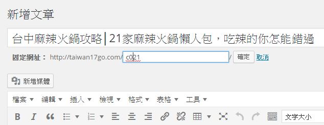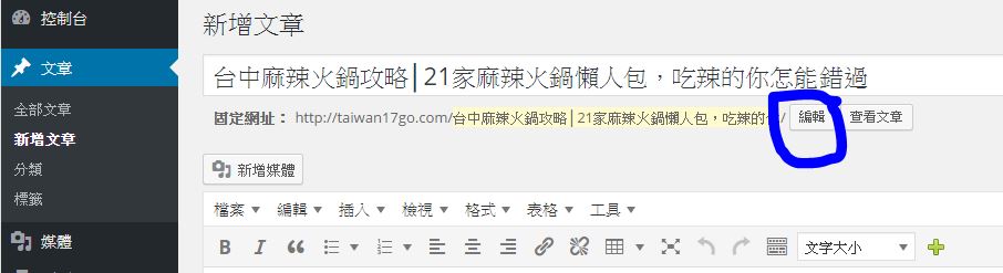 首先先輸入文章標題,此時你會在下方看到一段固定網址,一開始是中文的,記得點選後方的編輯。