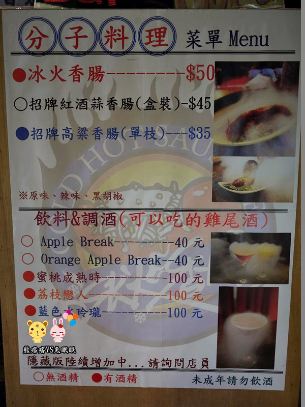 這家店賣的東西是跟分子料理有關係,所以價位也會稍微高一點,例如超特別的冰火香腸,一根就要價50元,其實我很好奇老闆為什麼會想在逢甲夜市開這種店,逢甲不是主打便宜為主嗎?客人可以接受這樣的價格嗎?雖然一般的分子料理很貴沒錯,這樣的香腸在餐廳可能賣幾百塊都算便宜,但在逢甲夜市則還有值得觀望的空間存在。