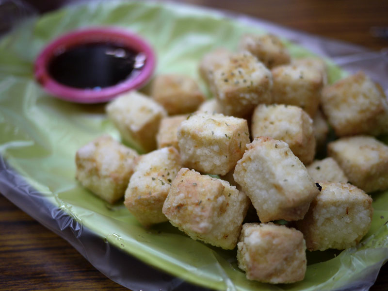 【逢甲夜市】金門炒泡麵與黃家金磚:剛炸起來的豆腐,外皮很酥,中間雖然感受不到很嫩,卻充滿一股香香的熱氣,沾上醬汁真是絕配!
