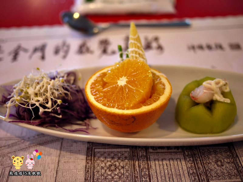 今天的第二道菜是水果沙拉,有柳橙跟奇異果,透過生菜的裝飾,營造出一種小巧可愛的感覺。