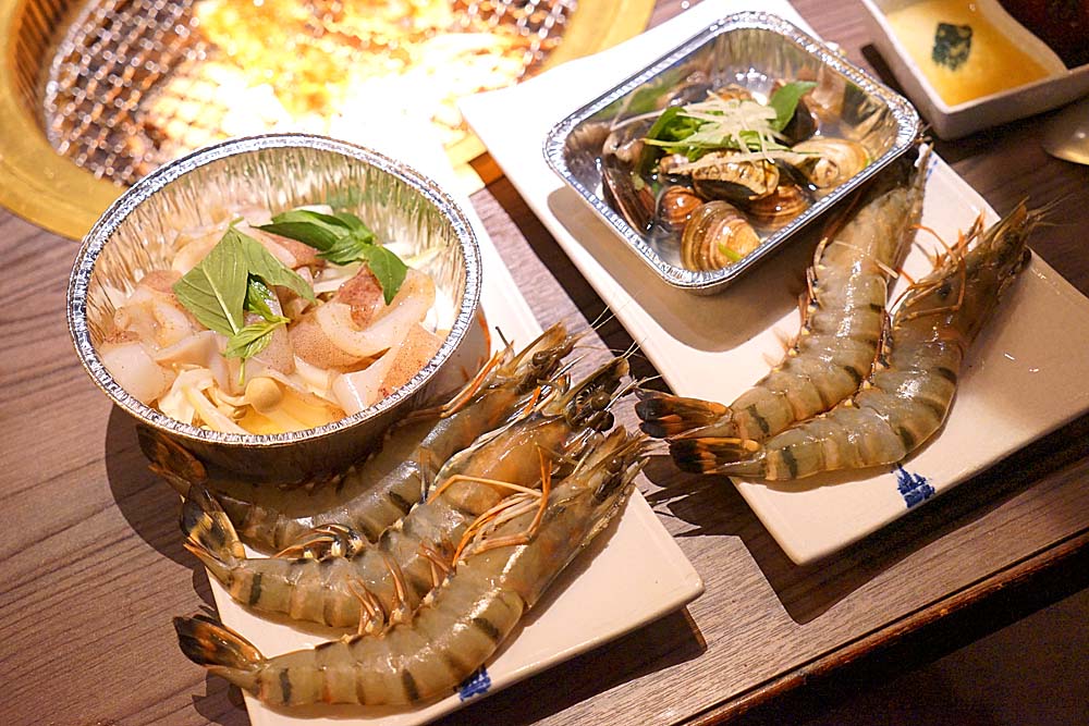 蝦子部分後來是由服務人員幫其他人剝的,直接用烤肉的夾子處理,後來偷偷學他怎麼處理殼的,第二次再去吃的時候,就自己學著剝給別人吃。