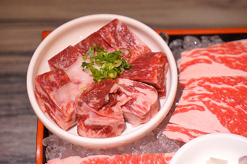 澳洲和牛肋條,吃的時候帶點微筋,另外一個人吃起來則無感受到,我覺得吃起來有兩種不同的口感存在,油花多的部分受熱後與肉質熔為一體,另一部分則帶些嚼勁。