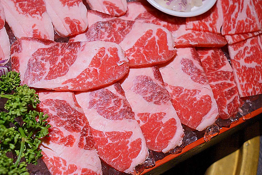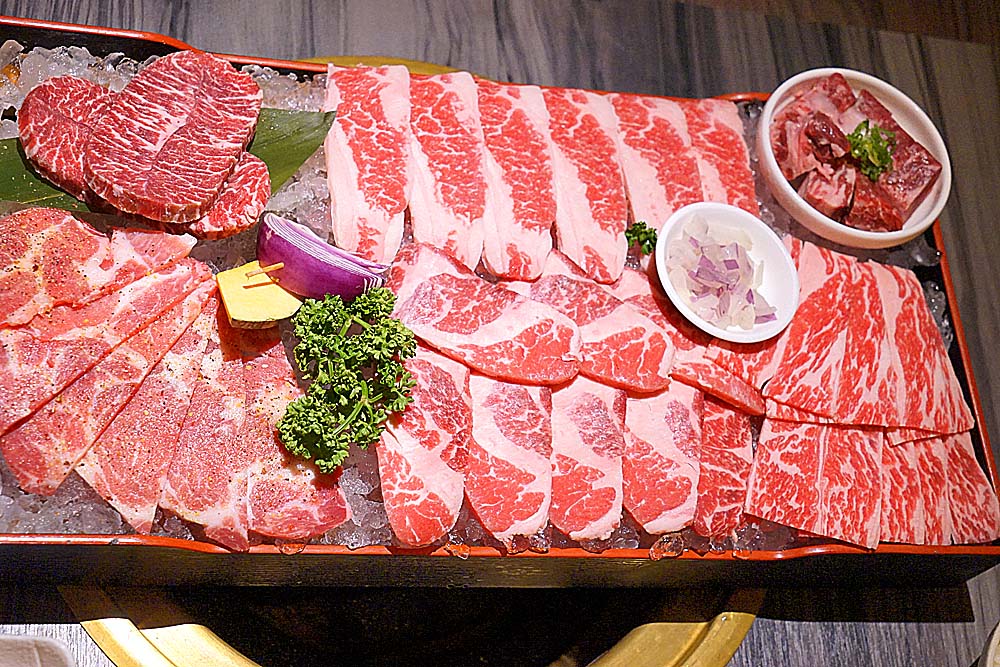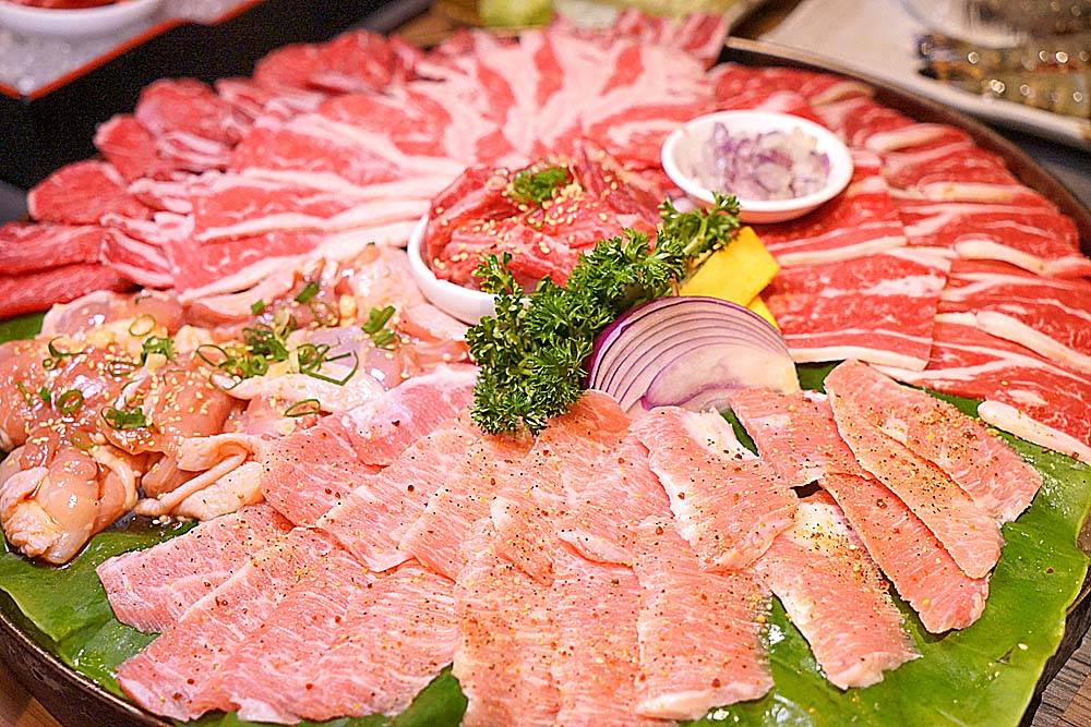 1680雙人套餐組合,附餐有有凱薩沙拉、包肉生菜、泡菜、冰沙、白飯等,肉盤部分以牛肉為大宗,有梅花豬、美國牛五花、無骨雞腿肉、美國嫩肩牛肉、美國無骨牛小排、美國牛肋條六種,蠻豐富的。